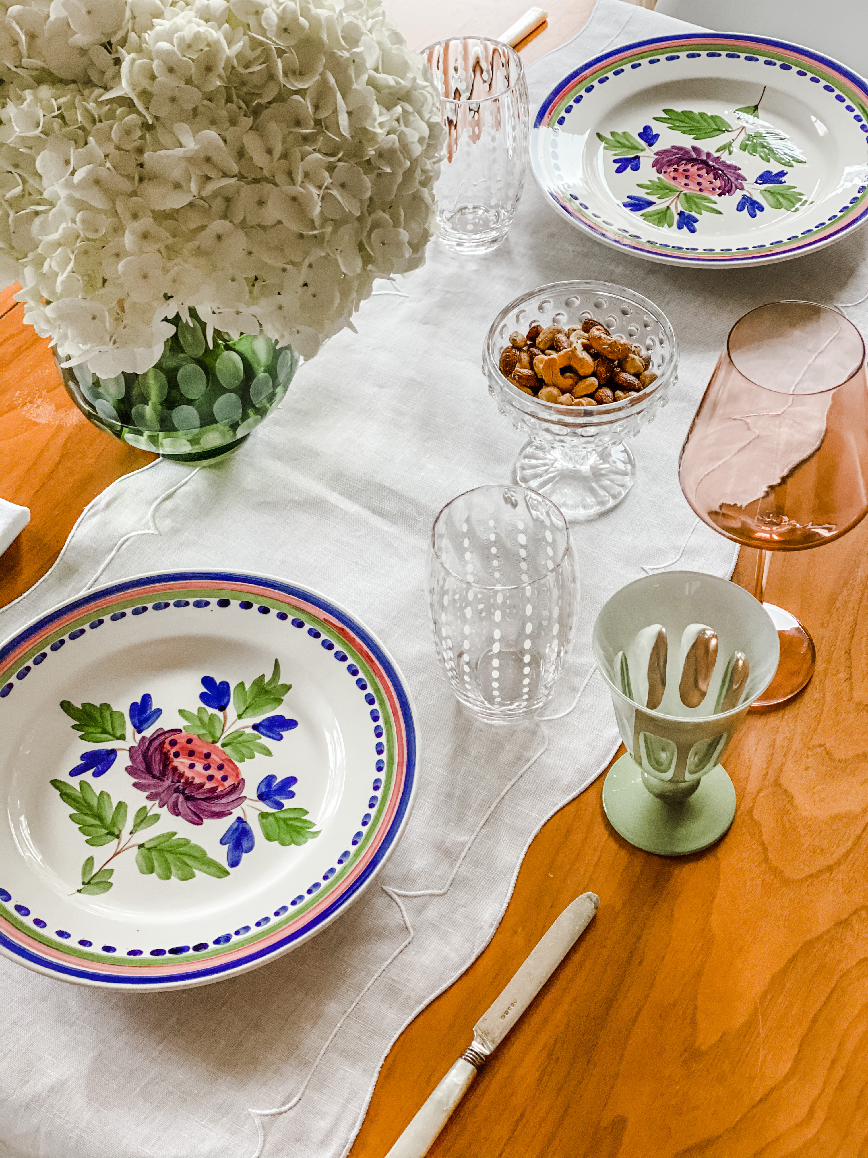 This light and airy table feels like a fresh start to the year. I was drawn to these plates immediately because of the happy design. I wanted the plates to be the star of the show, so I decided on neutral accents that played off the plate’s color palette. I used a linen table runner instead of placemats and simple napkins.