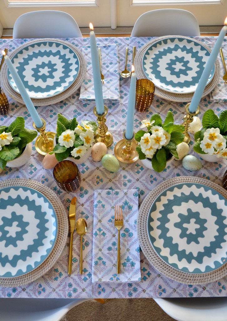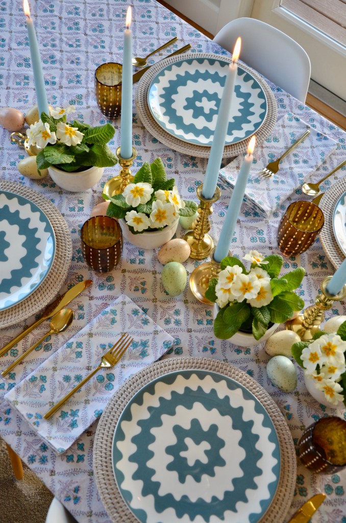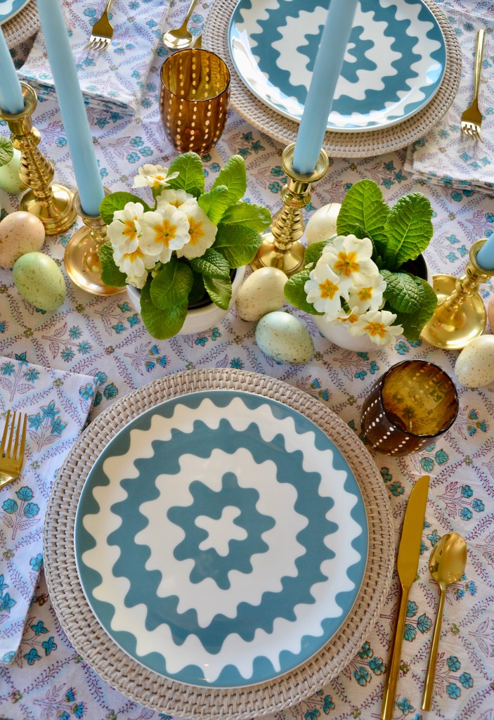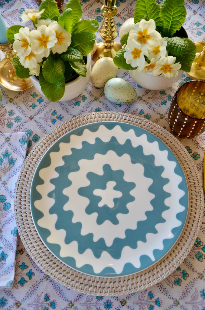 It’s no secret that I love India Amory linens. Napkins and tablecloths from the brand are on constant rotation on my table and often make appearances on my Instagram posts. I had just finished watching the show Bridgerton when the Trelliage print tablecloth was released in cerulean. It was love at first sight! This table is modern day Bridgerton meets Easter. I hope you enjoy it!