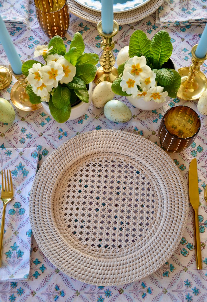 Tablecloth// Napkins// Plates (Host Home – Sold Out)// Chargers// Easter Eggs// Flatware// Candles// Brass Candlesticks (Similar)// Glasses