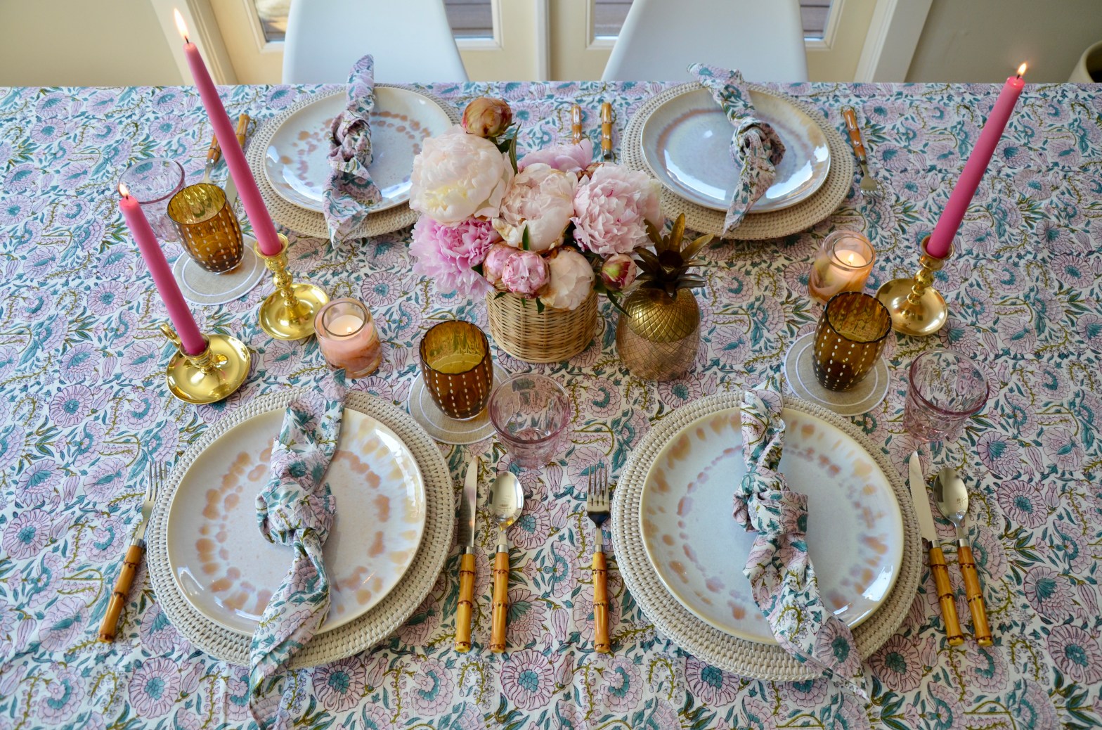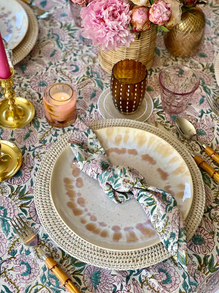 You can often find me scrolling through Instagram looking for new ideas on how to style my collection of block printed linens. One of my absolute favorite accounts to follow is the Malabar Collective by Orelene (@themalabarco). I love how she mixes and matches colors and patterns on her tables. She also puts together the best floral arrangements. I highly recommend following along!