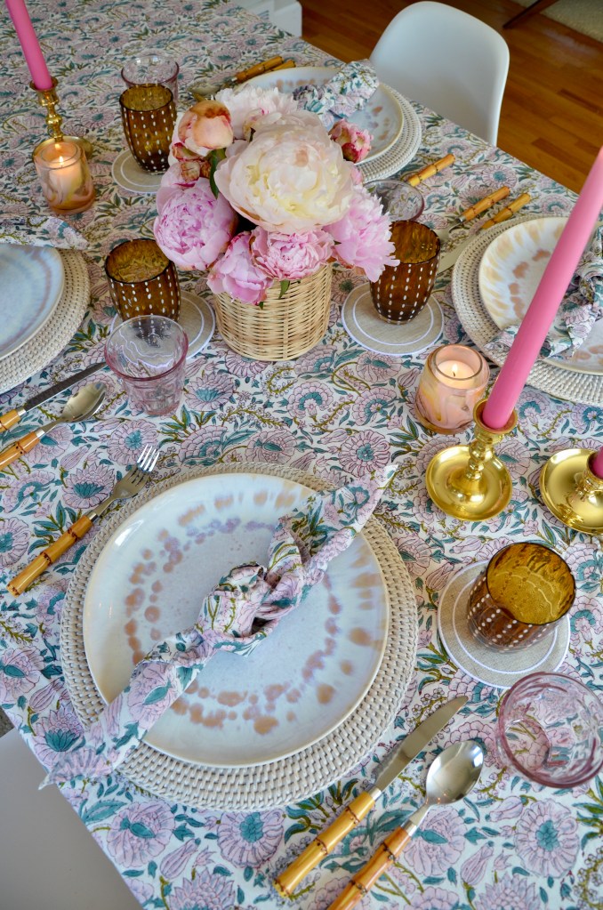Adding a new tablecloth is one of the easiest ways to breathe new life into your glassware and plates. It’s also a great way to try out different colors and patterns in your home without a huge investment. Lately I’ve been really loving block printed tablecloths. The pattern and color options are endless, so my collection seems to just keep growing. I also find them to be very easy to care for, which is always a plus!