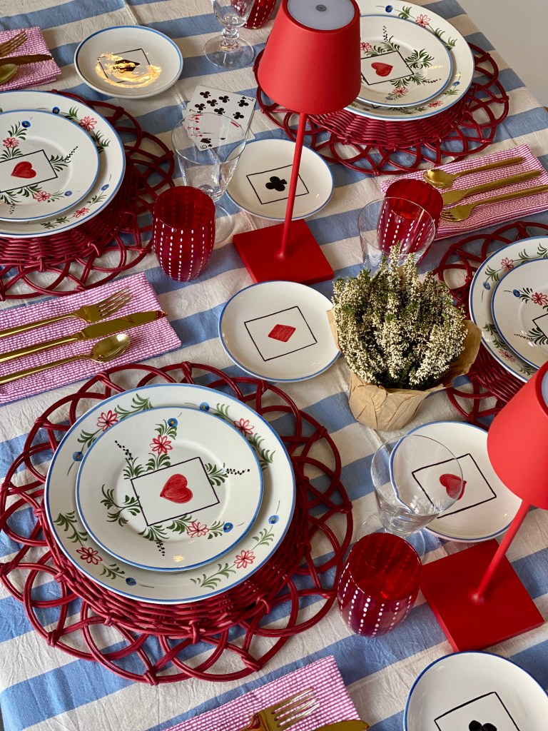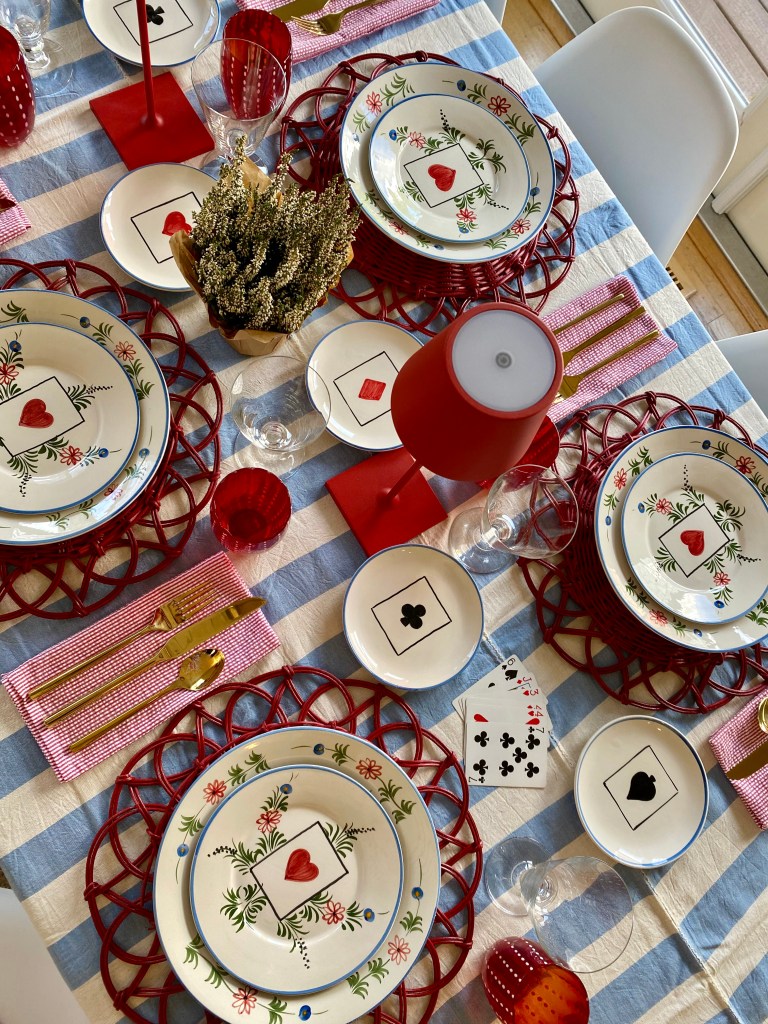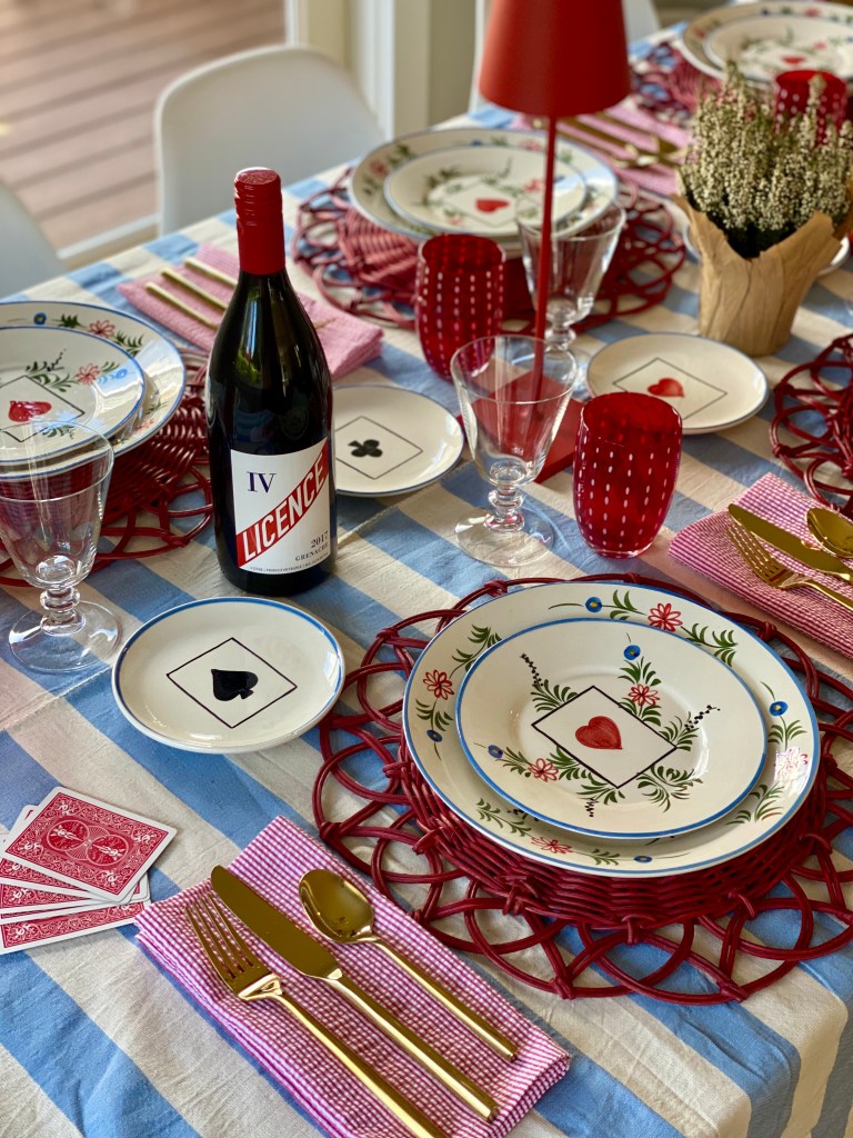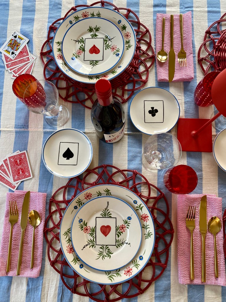 The best part of this new tradition is that I get an excuse to set the table each week. These Casa Lopez dishes couldn’t be more perfect with their hand painted card motifs. I love the floral design featured on the dinner and salad plates- it adds the perfect amount of femininity. I decided to play up the red and light blue that is featured in the dinner plates when setting this table. You can just as easily use black, white, or green as the accent color for these fabulous dishes. I happened to find them on sale, so make sure to snatch them up if they strike your fancy. Cheers!